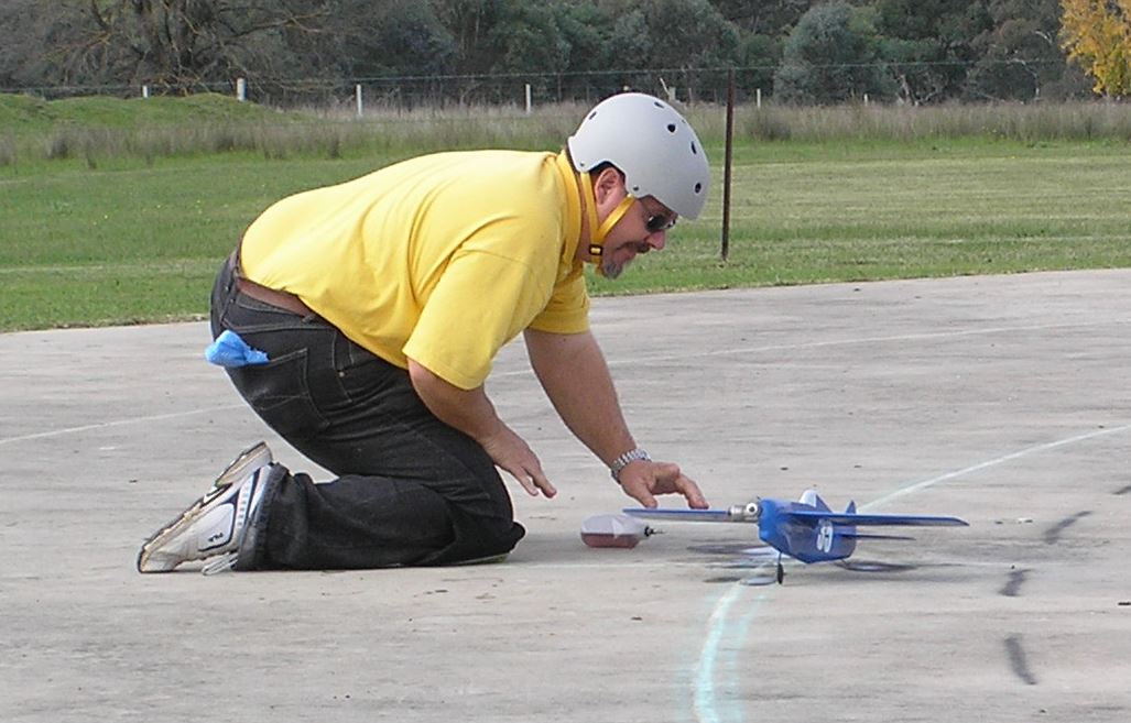 Having Ric Justic on your team can only be described as a bonus!  That’s either pitting or flying.  Flying for Paul, the team made 4.22.75 and pitting for John, they made 4.22.72.  3/100th of a second decided 2nd spot in the final!!  So much for this ‘rounding off times’ nonsense.  Ron Lacey had Murray flying for him and they did a best of 4.23.78,  just over a second away from a place in the final.  Next time, Ron!  As this Albury fun fly was very much a ‘mix ’n’ match’ affair, Ron did get a second chance to fly the final, this time pitting for John Hallowell.