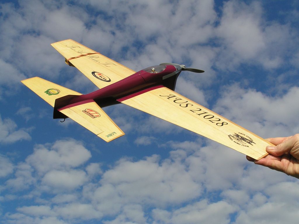 Perky attracted a good number of entries and some entertaining flying in the Pylon.  Much like Harry’s Proto (Class 2 racer) the Perkys were generally easy running and starting setups, allowing for some needle twiddling and comp. twisting between attempts. All except Paul Stein’s apparently loaner G20/15.  This seemed touchy to tune and hard to start, as well as being a little down on ultimate power. Time for a rebuild… or just give it back and change powerplants? Richard Justic’s monoline 60 model only came out twice.   Once with him hanging on (literally) and then with Murray Wilson having his left arm stretched to match his right. Steve Rothwell’s audio tach showed it was only reaching 18K RPM in air so it’s definitely overloaded, but is still a reasonable performer for a stock standard Rossi 61.