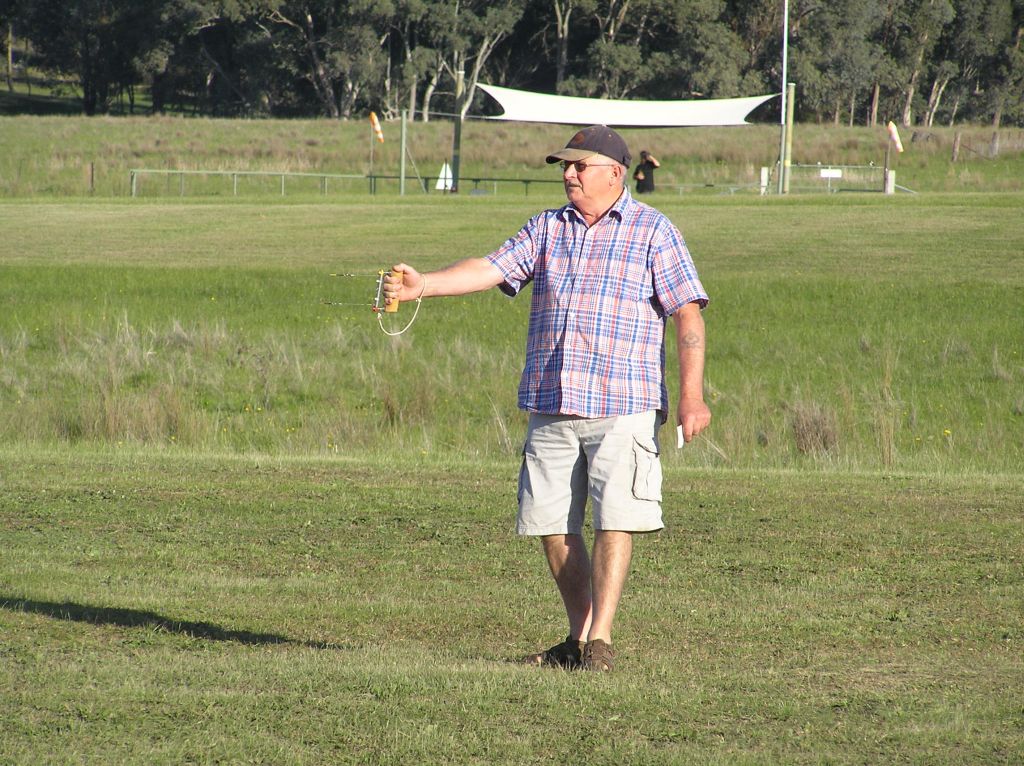 An incident took place that we never like to see…  The Wilson/Wilson entry was in the process of take off during a heat when the model clipped the pitman’s knee.  Away it went into the air before it snapped the lines and went free flight over the stunt circle.  Gavan Opperman was flying aerobatics at the time and he later said he saw out of the corner of his eye this shape flash past above his head.  He thought perhaps it was a bird, a wayward radio model or some kind of UFO!  He then heard a loud thud … and thought he had crashed his stunter before he was jolted back to reality!  When he realized he could still feel a tug on the end of his lines, Oppy felt relieved.   The impact nose was just the Willow’s 27 G/Y imbedding itself into the nearby ground.   Fortunately, no damage was done but, on reflection, we all need to take extra care as these type of accidents have the potential to come back and bite us hard where the sun don’t shine…