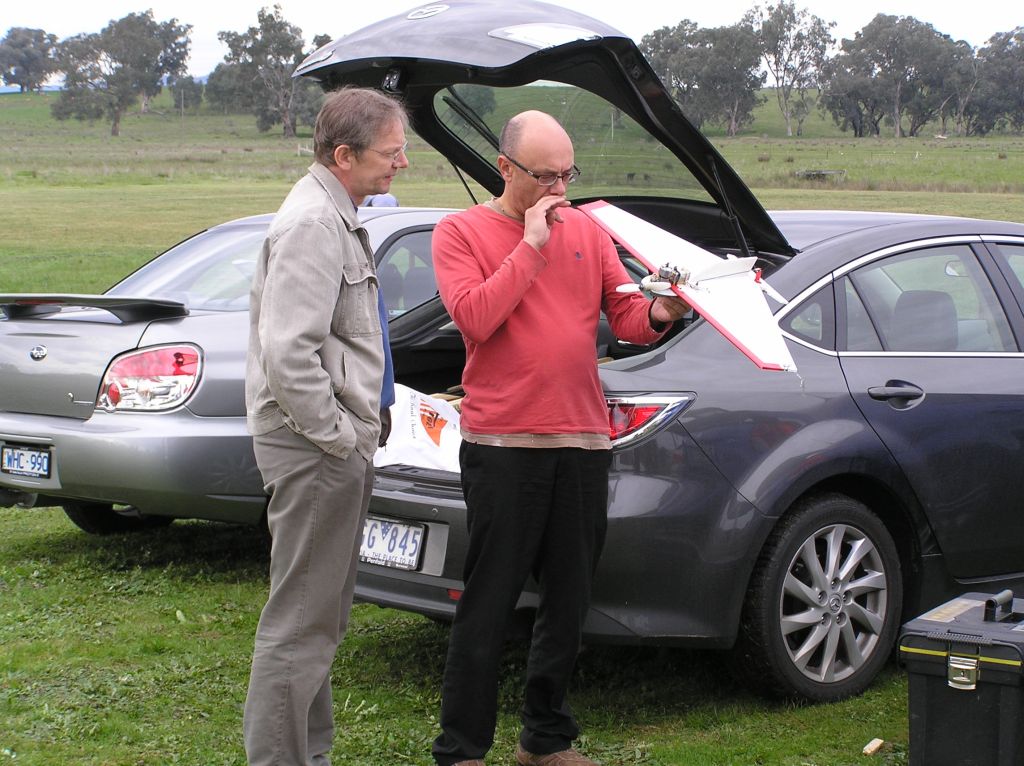 Nigel and Tony inspect a Corflute Combat model.