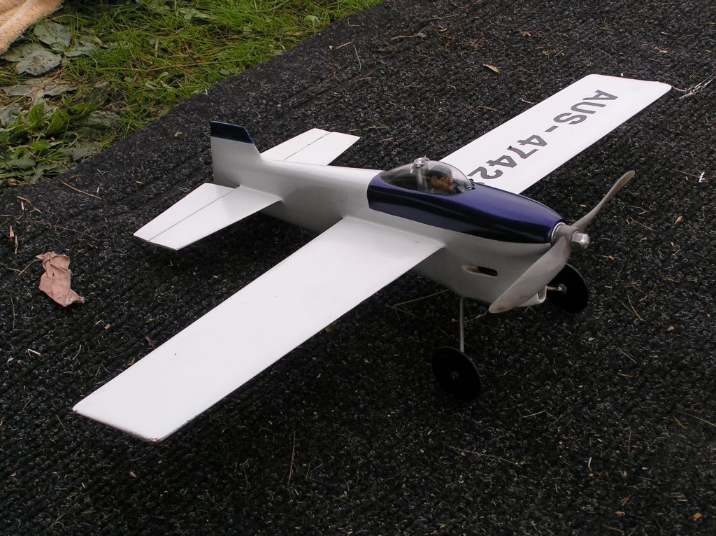 Perky attracted a good number of entries and some entertaining flying in the Pylon. Much like Harry’s Proto (Class 2 racer) the Perkys were generally easy running and starting setups, allowing for some needle twiddling and comp. twisting between attempts. All except Paul Stein’s apparently loaner G20/15. This seemed touchy to tune and hard to start, as well as being a little down on ultimate power. Time for a rebuild… or just give it back and change powerplants? Richard Justic’s monoline 60 model only came out twice. Once with him hanging on (literally) and then with Murray Wilson having his left arm stretched to match his right. Steve Rothwell’s audio tach showed it was only reaching 18K RPM in air so it’s definitely overloaded, but is still a reasonable performer for a stock standard Rossi 61.