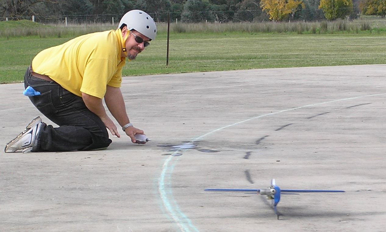 Having Ric Justic on your team can only be described as a bonus!  That’s either pitting or flying.  Flying for Paul, the team made 4.22.75 and pitting for John, they made 4.22.72.  3/100th of a second decided 2nd spot in the final!!  So much for this ‘rounding off times’ nonsense.  Ron Lacey had Murray flying for him and they did a best of 4.23.78,  just over a second away from a place in the final.  Next time, Ron!  As this Albury fun fly was very much a ‘mix ’n’ match’ affair, Ron did get a second chance to fly the final, this time pitting for John Hallowell.