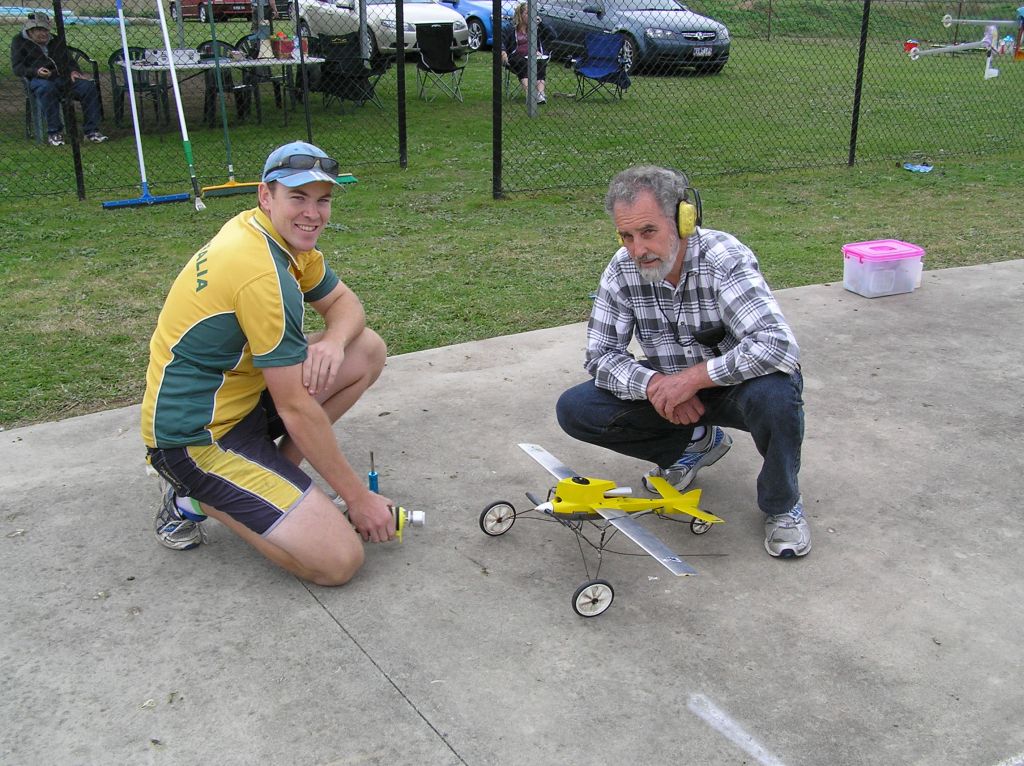 Having Ric Justic on your team can only be described as a bonus!  That’s either pitting or flying.  Flying for Paul, the team made 4.22.75 and pitting for John, they made 4.22.72.  3/100th of a second decided 2nd spot in the final!!  So much for this ‘rounding off times’ nonsense.  Ron Lacey had Murray flying for him and they did a best of 4.23.78,  just over a second away from a place in the final.  Next time, Ron!  As this Albury fun fly was very much a ‘mix ’n’ match’ affair, Ron did get a second chance to fly the final, this time pitting for John Hallowell.