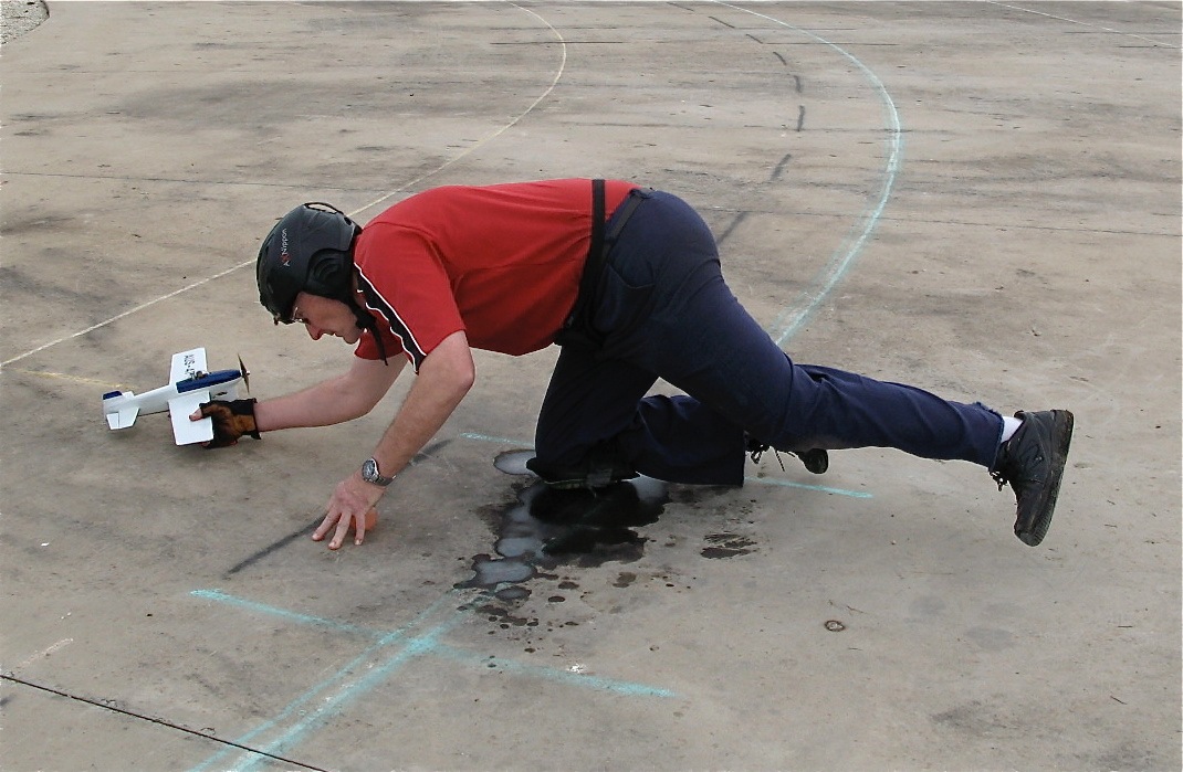 An incident took place that we never like to see…  The Wilson/Wilson entry was in the process of take off during a heat when the model clipped the pitman’s knee.  Away it went into the air before it snapped the lines and went free flight over the stunt circle.  Gavan Opperman was flying aerobatics at the time and he later said he saw out of the corner of his eye this shape flash past above his head.  He thought perhaps it was a bird, a wayward radio model or some kind of UFO!  He then heard a loud thud … and thought he had crashed his stunter before he was jolted back to reality!  When he realized he could still feel a tug on the end of his lines, Oppy felt relieved.   The impact nose was just the Willow’s 27 G/Y imbedding itself into the nearby ground.   Fortunately, no damage was done but, on reflection, we all need to take extra care as these type of accidents have the potential to come back and bite us hard where the sun don’t shine…
