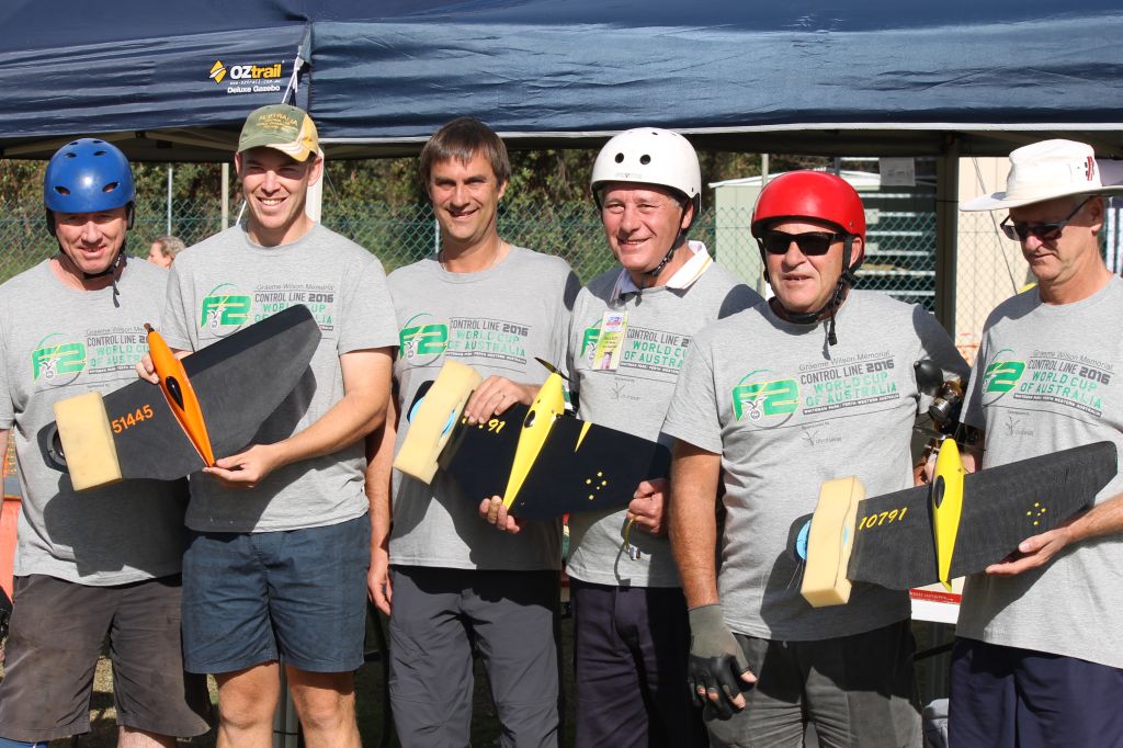 World Championship & World Cup Competition. Australia confirmed its ranking in theF2C Team Race class by taking out first and second place. The team of Rob Fitzgerald and Mark Ellins, World Champions in 2010 and again in 2016, set a world record time of 6 mins 22.8 seconds to complete 200 laps. There was little between the competitors. Second place was Murray Wilson and Mark Poschkens in a time of 6:23.3 and the French Team of Thierry Ougen and Roland Surugue completed in 6:28.6. Australia won Gold and Silver plus the team prize for F2C Team Racing.