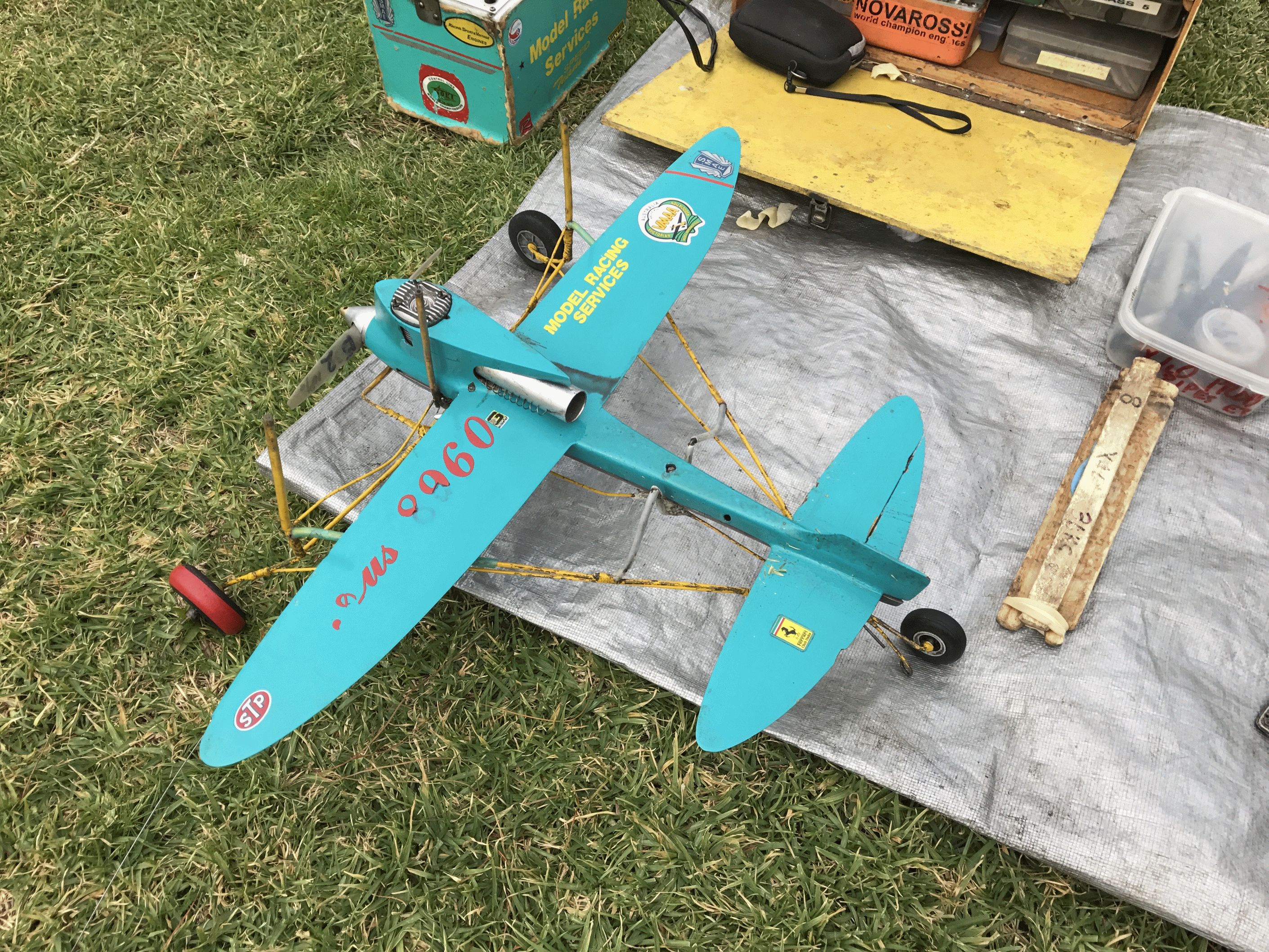 Murray had done some testing of his Nelson .29 model the week previous, he has had to find a lower Pitch prop for his piped motor for 10% nitro, he ended up using a SHERLOCK single blade that Stuart made for my .21 model years ago. I was going to try my [Dud] Dub Jett 40 in place of my ST X40, but it did not run right as the piston kept expanding. So instead, I fitted up another old piston and liner from all the worn out X40 bits to make a good fit and ran it in, managed to do 2 good flights slightly faster than I did in February.