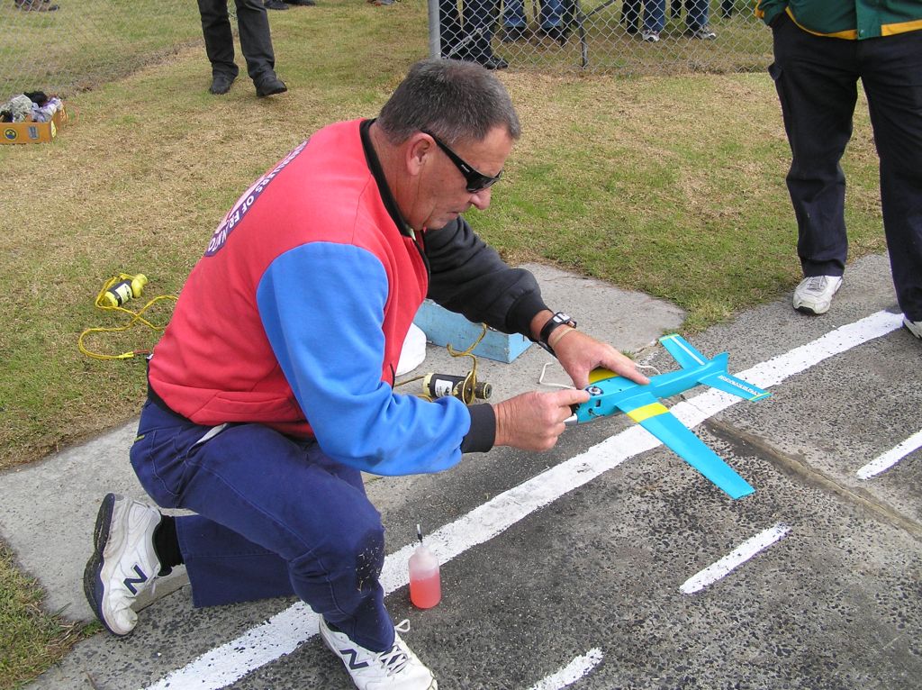 All three models were quickly in the air at the start of the race and were circulating at a steady even pace. At the first pit stop it was evident that the Bailey/Roberts “K31” was getting a little more range than the other two models and was marginally quicker in airspeed. After the second pit stop the “K31” slowed off a little with a lean setting and gained some extra range. At the next stop Peter opened the needle a little and the speed returned and it was looking that a first place was on the cards for Harry and Peter but on lap 153 the outboard wing folded upwards and the model took a dive into the concrete with a resultant total write off for the model. Wilson/Baker took the winners honours with a time of 7:09.34.