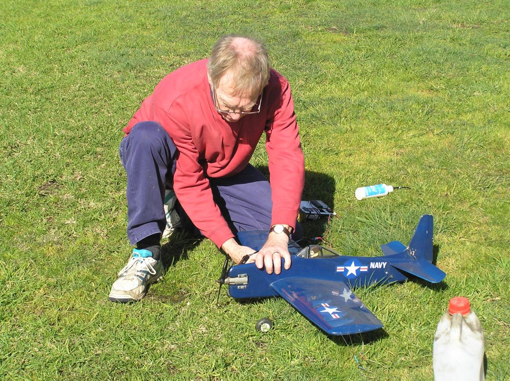 Harry preps his Brodak Bearcat Navy Carrier model powered by a Thunder Tiger 36 motor.