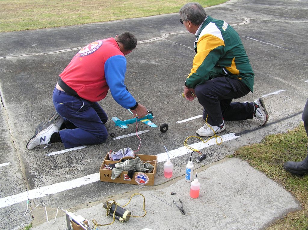 All three models were quickly in the air at the start of the race and were circulating at a steady even pace. At the first pit stop it was evident that the Bailey/Roberts “K31” was getting a little more range than the other two models and was marginally quicker in airspeed. After the second pit stop the “K31” slowed off a little with a lean setting and gained some extra range. At the next stop Peter opened the needle a little and the speed returned and it was looking that a first place was on the cards for Harry and Peter but on lap 153 the outboard wing folded upwards and the model took a dive into the concrete with a resultant total write off for the model. Wilson/Baker took the winners honours with a time of 7:09.34.