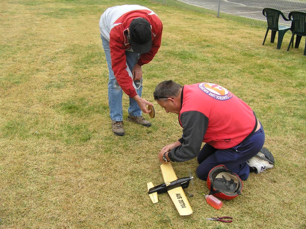 All three models were quickly in the air at the start of the race and were circulating at a steady even pace. At the first pit stop it was evident that the Bailey/Roberts “K31” was getting a little more range than the other two models and was marginally quicker in airspeed. After the second pit stop the “K31” slowed off a little with a lean setting and gained some extra range. At the next stop Peter opened the needle a little and the speed returned and it was looking that a first place was on the cards for Harry and Peter but on lap 153 the outboard wing folded upwards and the model took a dive into the concrete with a resultant total write off for the model. Wilson/Baker took the winners honours with a time of 7:09.34.