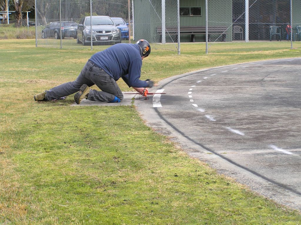 Wilson/Baker took a few practice tanks to get a race setting on the R250 in Neils “Olympian” but were eventually good to go. Mark had fitted a (tuned) Parra T3 in his “Dimpled Dumpling” and was giving the com-bination its first race outing. The engine had previously been used in a Classic FAI model but was yet to be tested for Vintage A.