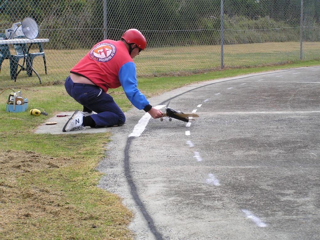 Wilson/Baker took a few practice tanks to get a race setting on the R250 in Neils “Olympian” but were eventually good to go. Mark had fitted a (tuned) Parra T3 in his “Dimpled Dumpling” and was giving the com-bination its first race outing. The engine had previously been used in a Classic FAI model but was yet to be tested for Vintage A.