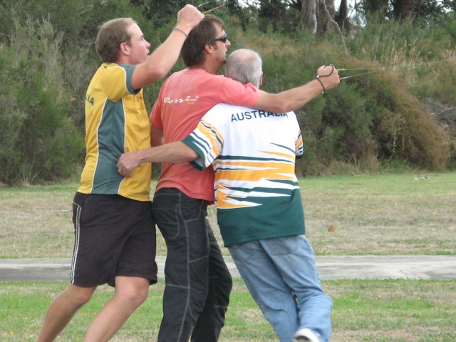 Now for the final.  All were away smartly and everyone was going fast.  It was always going to be close and any mishaps along the way were bound to be costly.  The bouncy Knox grass is always a test. Two of the three pilots and one pitman contested the final of last years F2C World Championship.  As is usual, to win a Vintage A final down under, you have to beat some of the world’s best team race competitors.