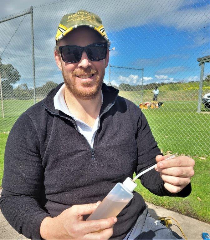 Combined Speed & Vintage Combat. It was a busy contest day down at the CLAMF field today. The concrete circle had dried out for some Combined Speed to take place and in the afternoon, six entrants flew Vintage Combat in sunny conditions. The grass was very soggy and there were a few splash/crash landings. Greg Nelson donated some of his Taipan propellers to the three top placed competitors in Vintage Combat.