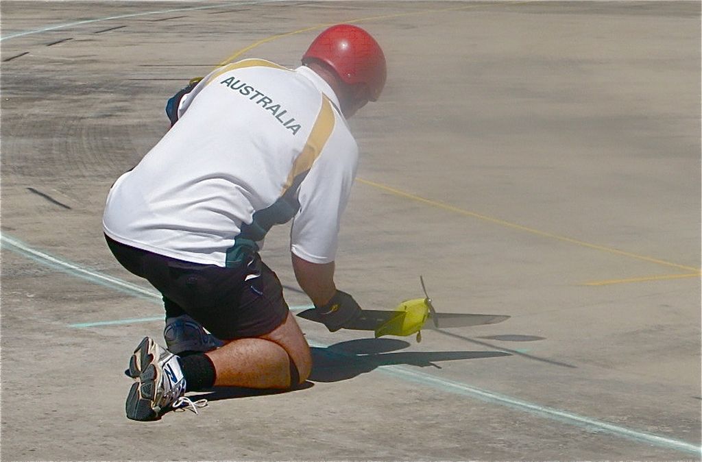 The inaugural Classic FAI T/R race commenced with 15 traditional styled team racers competing in a Concours d’ Elegance. Professionally judged by former FAI team race winner and stunt flyer Brian Ether and expert control line builder Tony Bonello, all the models were laid out for display on the concrete at the Twin Cities flying site. After some model rearranging where the judges put the best models to the front, and Ooo’s and Ahhh’s from the spectators, Paul Steins beautiful Espadon was the eventual winner. Paul accepted a bottle of Australian Sparkling wine as his prize. This was a classy start to the days racing. Thanks to both judges for taking their time to contribute to this first ever Nationals event.