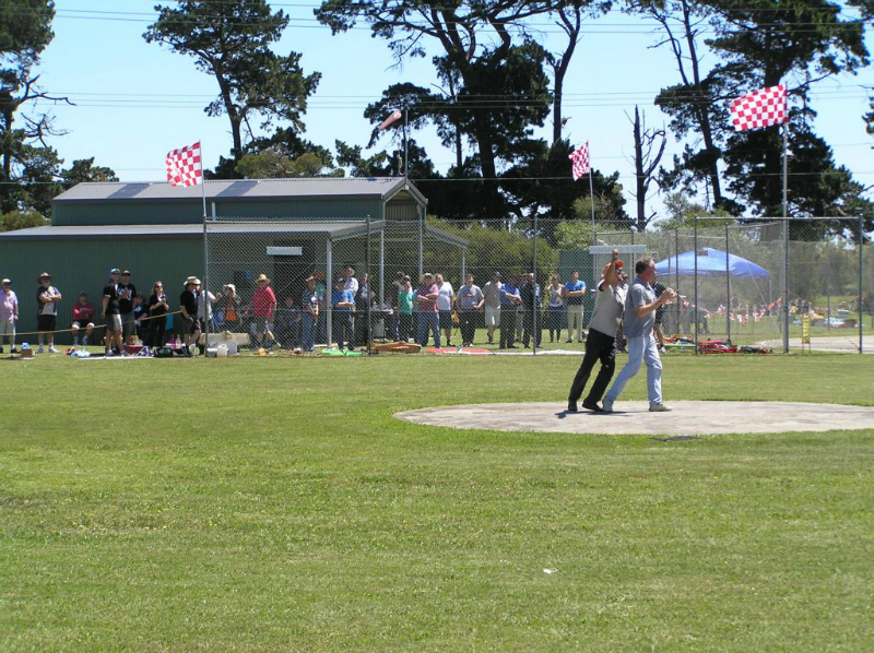 The weather was near perfect with constant sunshine all day.  The demonstrations included Speed, Aerobatics, Carrier Deck, Vintage Combat, F2D Combat, F2C, Classic FAI and special flights by Open Combat, Open Rat Race and Classic B models.  Some of these flights were performed by 2010 F2C World Champion Mark Ellins and 2012 World Champs finalist, Murray Wilson.  Master of Ceremonies Andrew Nugent gave the crowd informative commentaries on the portable loudspeaker about many of the events, especially Classic FAI team race.