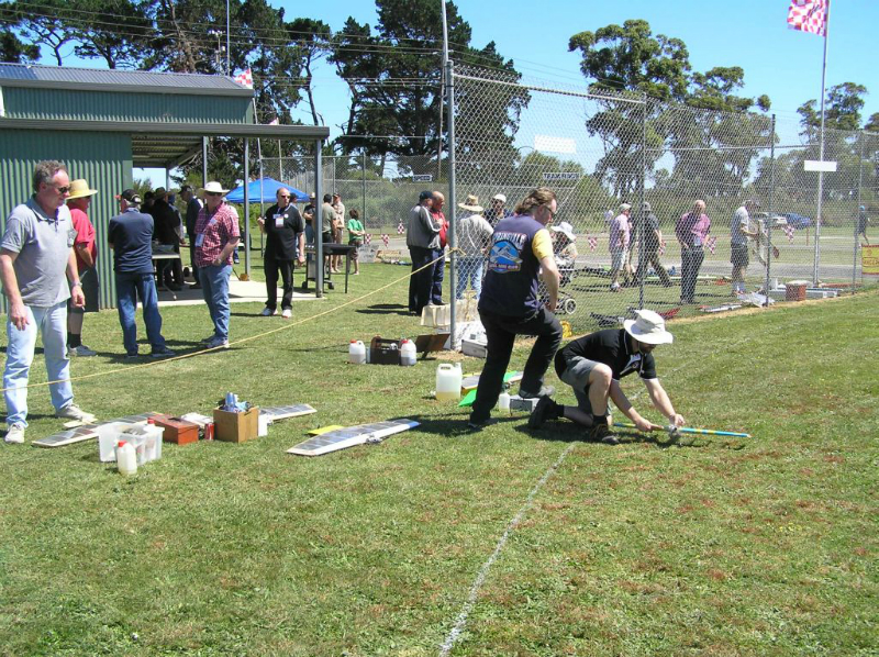 The weather was near perfect with constant sunshine all day.  The demonstrations included Speed, Aerobatics, Carrier Deck, Vintage Combat, F2D Combat, F2C, Classic FAI and special flights by Open Combat, Open Rat Race and Classic B models.  Some of these flights were performed by 2010 F2C World Champion Mark Ellins and 2012 World Champs finalist, Murray Wilson.  Master of Ceremonies Andrew Nugent gave the crowd informative commentaries on the portable loudspeaker about many of the events, especially Classic FAI team race.