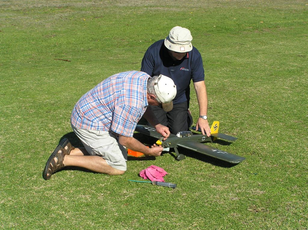Peter K and Steve pre-flighting the Stuka Warbird Stunt model.