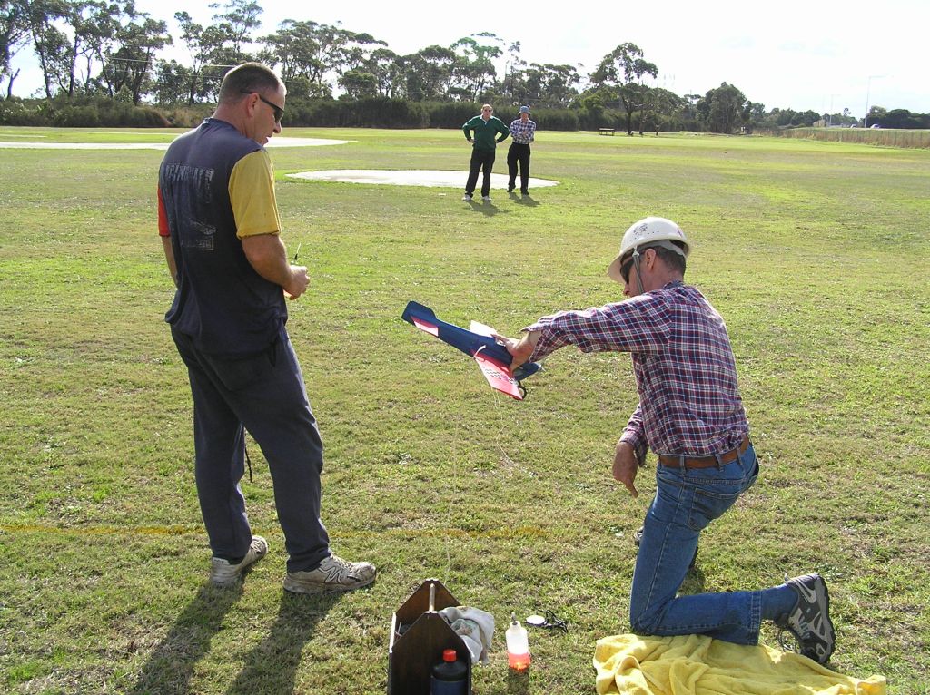 Next heat was Graeme Wilson and Paul Stein vs Ken Hunting and Mark Ellins. Paul was expecting big things from his Irvine 25 Rocket, having recently swapped engines. The Irvine replaces his much revered and record breaking Alan Barnes Enya. It was up against Ken’s own design GMS 25 racer, capably flicked by the World Champ himself, Mark Ellins. They crossed the line first in 3.25.07. It was disappointment for Graeme and Paul. They were away first and had superior airspeed. As usual, Graeme nailed the landing, Paul took his regular fast catch, but the Irvine refused to fire up. It had lunched on the cold Rossi no.4 and a 47 DNF was entered beside their names.