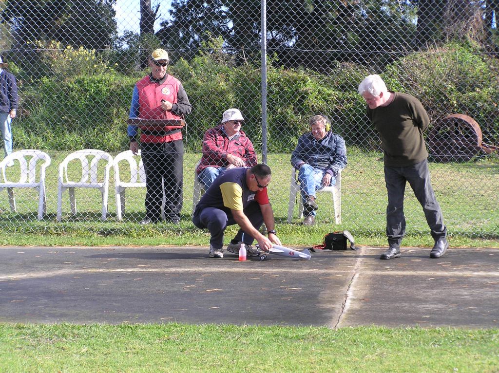 Next heat was Graeme Wilson and Paul Stein vs Ken Hunting and Mark Ellins.  Paul was expecting big things from his Irvine 25 Rocket, having recently swapped engines.  The Irvine replaces his much revered and record breaking Alan Barnes Enya.  It was up against Ken’s own design GMS 25 racer, capably flicked by the World Champ himself, Mark Ellins.   They crossed the line first in 3.25.07.  It was disappointment for Graeme and Paul. They were away first and had superior airspeed.  As usual, Graeme nailed the landing, Paul took his regular fast catch,  but the Irvine refused to fire up.  It had lunched on the cold Rossi no.4 and a 47 DNF was entered beside their names.