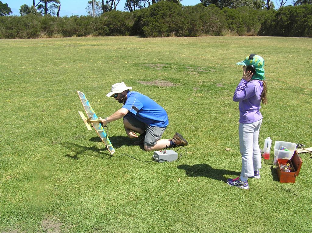 To wind up the day’s program, it was time for 27 Goodyear. Only three teams took part and two rounds were flown.  Graeme and Murray Wilson recorded  a very fast 5.07.22 with a Super Tigre G20D.   Paul Stein and Mark Ellins were going well until the last tank of the first heat. It was then that Paul noticed the broken fuzz… right behind the wing and severely hampering the down control. Paul could see the crack from the centre circle… Scary stuff!    Harry Bailey and Peter Roberts were using a Nelson and easily getting all the necessary speed.