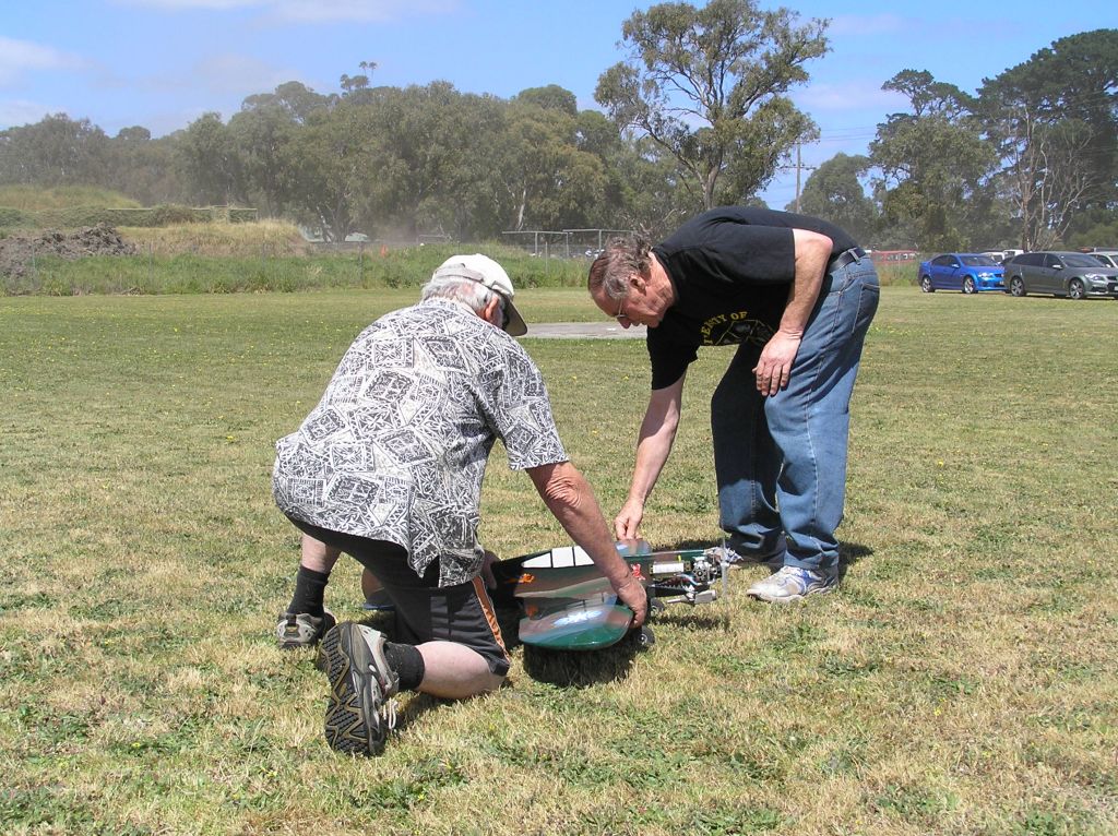 To wind up the day’s program, it was time for 27 Goodyear. Only three teams took part and two rounds were flown.  Graeme and Murray Wilson recorded  a very fast 5.07.22 with a Super Tigre G20D.   Paul Stein and Mark Ellins were going well until the last tank of the first heat. It was then that Paul noticed the broken fuzz… right behind the wing and severely hampering the down control. Paul could see the crack from the centre circle… Scary stuff!    Harry Bailey and Peter Roberts were using a Nelson and easily getting all the necessary speed.