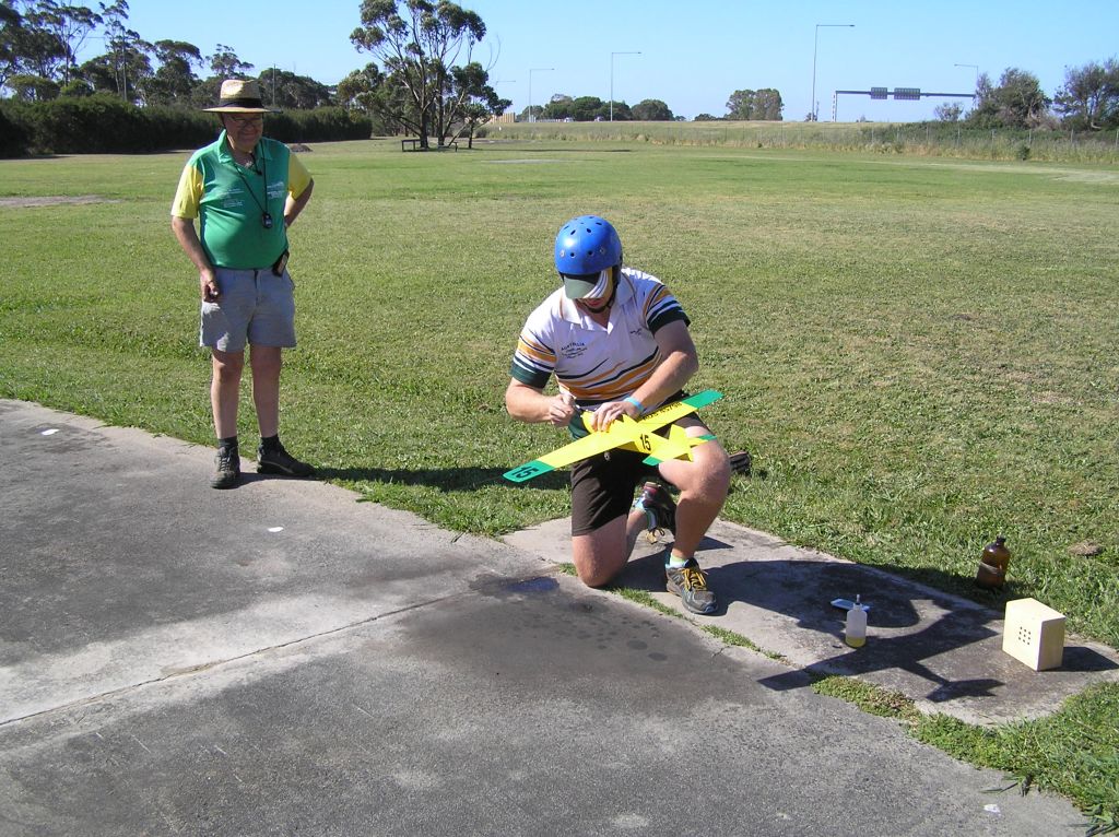 To wind up the day’s program, it was time for 27 Goodyear. Only three teams took part and two rounds were flown.  Graeme and Murray Wilson recorded  a very fast 5.07.22 with a Super Tigre G20D.   Paul Stein and Mark Ellins were going well until the last tank of the first heat. It was then that Paul noticed the broken fuzz… right behind the wing and severely hampering the down control. Paul could see the crack from the centre circle… Scary stuff!    Harry Bailey and Peter Roberts were using a Nelson and easily getting all the necessary speed.
