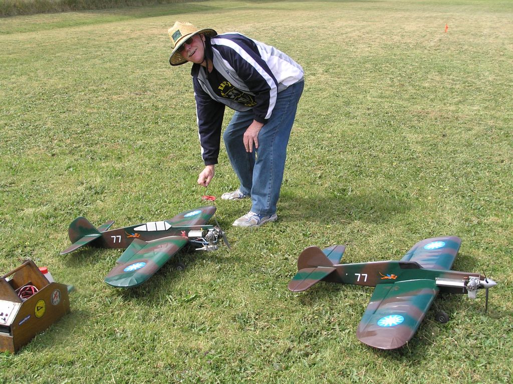 To wind up the day’s program, it was time for 27 Goodyear. Only three teams took part and two rounds were flown.  Graeme and Murray Wilson recorded  a very fast 5.07.22 with a Super Tigre G20D.   Paul Stein and Mark Ellins were going well until the last tank of the first heat. It was then that Paul noticed the broken fuzz… right behind the wing and severely hampering the down control. Paul could see the crack from the centre circle… Scary stuff!    Harry Bailey and Peter Roberts were using a Nelson and easily getting all the necessary speed.